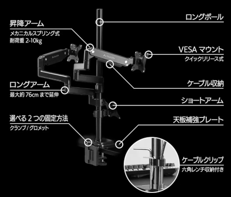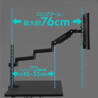 アームは最大76cmという圧倒的な長さ。通常モデルよりも長い「ロングポール」で、複数モニターでも高さ調整が自由自在になる。大型モニター+サブモニターの組み合わせ、角度や向きの細かい変更、視界いっぱいの没入環境などのこだわりも満たしてくれる。