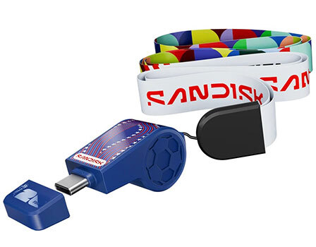 シリーズの中でも象徴的な製品となるのが、ホイッスル型のUSB-Cフラッシュドライブ。グローバルエディションに加え、米国・カナダ・メキシコといった開催国バージョンも展開。今春にはプレミアムのゴールドエディションも発売予定だ。