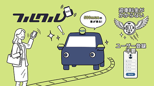 「フルクル」は、東京都・神奈川県内のサービス提供エリア内で利用できる、スマホを振るだけで近くのkmタクシーを呼べるアプリ。アプリを起動して、乗りたい場所でスマホを振る。顧客の周辺半径500m以内にいるkmタクシーに「乗りたい」という意思が伝わる。マッチングするとタクシーが迎えにいき、そのまま乗車できる。路上でタクシーをつかまえる感覚で使えるサービスとなっている。とくに、中央区・港区などのビジネス街や、タクシーが多く走る繁華街エリアなどで、短時間でタクシーをつかまえたいときに効率的に使うことが可能。ユーザー登録は不要で、アプリをダウンロードすればすぐに利用できる。