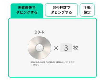 BDにダビングする際も、画質を優先するか、1枚のディスクにできるだけ多くの番組を収めるかを直感的な操作で簡単に選べるようになっている。もちろん、自分で画質とディスクの使用枚数を設定する「手動設定」もある。作成したディスクは、各社のBDプレーヤーやBDレコーダー、ゲーム機などで再生できる。PCで再生したい場合は、付属の「BDミレル」をインストールしたPCで観ることができる。