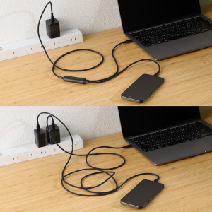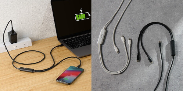 新製品は、1本のケーブルが2本に分岐する2WayタイプのUSB Type-Cケーブル。例えば、1ポートしかないAC充電器でも、本製品1本でスマートフォンやタブレット、PCなど2台の機器を同時に充電できるようになる。USB Power Deliveryに対応し、最大140Wで充電可能となっている。データ転送速度は最大480Mbps。