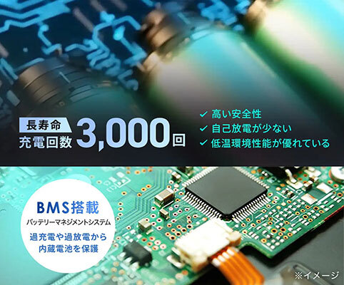 バッテリーには、電気自動車にも採用されているリン酸鉄リチウムイオン電池を使用。発火や爆発のリスクが低く、安全性に優れているほか、長寿命で繰り返し使用できる。