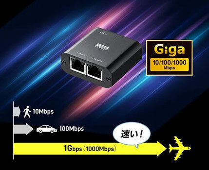 通信規格は1000BASE-T(ギガビット)に対応し、最大1000Mbpsの高速通信を実現。「AUTO-Negotiation」機能により、接続機器に応じて通信速度を自動で最適化する。大容量データの転送や高画質動画の視聴、オンラインゲームなど、帯域を必要とする用途でもストレスなく使える。