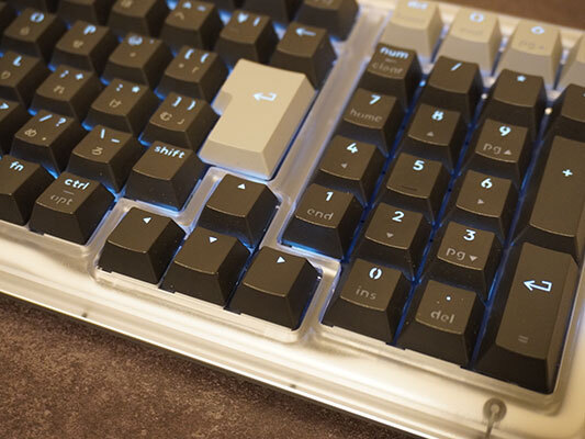 サイズがフルサイズではなく、やや小さい98%レイアウトとなっているのも、注目すべきポイントだ。パーツをぎっしり詰めて低く詰まった音を出すための工夫だが、作業スペースを少し広くとることができ、動きの無駄も減るため、効率性も上がったように感じる。矢印とテンキーの位置が通常より詰まっているので、慣れるまではちょっと違和感がある。「0」を押そうとして「→」を押してしまうことがたびたびあった。