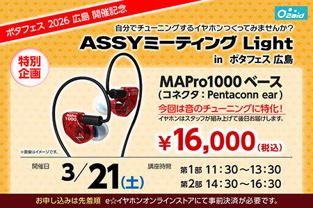 制作モデルは「MAPro1000ベース」(コネクタ:Pentaconn ear)で、価格は1万6000円。開催時間は第1部が11時30分~13時30分、第2部が14時30分~16時30分。参加にあたっては、「e☆イヤホン」オンラインショップでの事前決済が必要で、先着順での受付となる。
