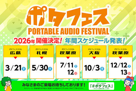 タイムマシンが運営するイヤホン・ヘッドホン専門店「e☆イヤホン」は3月21日11~17時に、イヤホン・ヘッドホンを中心としたポータブルオーディオの試聴&体験イベント「ポタフェス 2026 広島」を、広島県立広島産業会館(広島県広島市)西展示館の第2展示場にて開催する。入場は無料で、事前登録の必要はなく自由に入退場できる。
