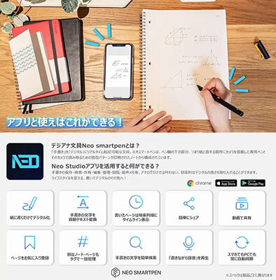 Neo smartpenのアプリ「Neo Studio 2」は、スマホ版だけでなくWebブラウザ版にも対応。どのデバイスでも手書きデータの閲覧や編集ができるほか、書いた過程を音付きで再生する。GoogleカレンダーやGoogleドライブと連携していることに加えて、スケジュール管理に便利なN plannerとも連動する。