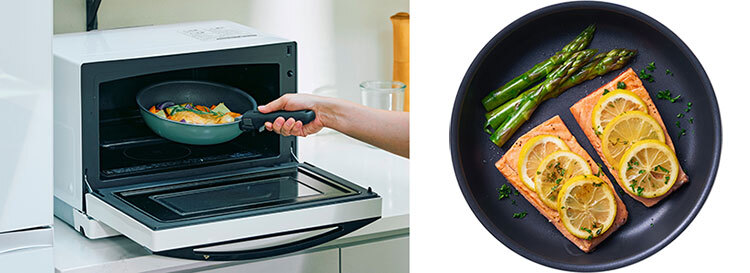 専用ハンドルを外せばオーブン調理が可能で、そのままお皿のようにも使えるので、できたての料理をそのまま食卓に出せる。