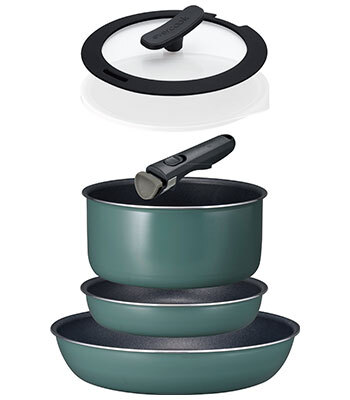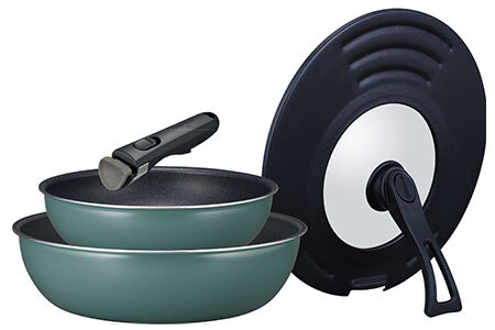 今回、発売される「evercook fit」は取っ手が取れる着脱式フライパンのセット品で、オール熱源対応なのでコンロを選ばず使用でき、どんなキッチンにもフィットする落ち着いたグリーンカラーを採用している。