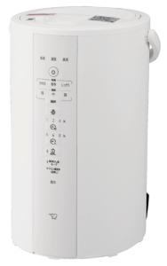 的場 加湿力がダントツに高いです。加湿量は標準モード使用時で最大860mL/hで、木造の部屋に換算すると14.5畳までに対応できます。そして気化ハイブリッド式なので、冬場でも気兼ねなく使っていただけます。