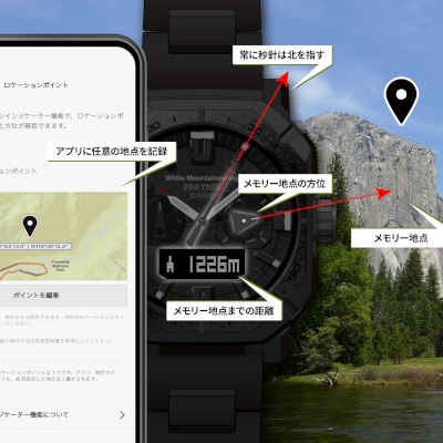 機能面では、「PRO TREK」唯一となる電波タフソーラーとBluetoothを搭載し、世界6局の標準電波受信とBluetoothの2wayによる自動時刻補正に対応。トリプルセンサーによる方位、気圧・高度、温度の計測機能、高輝度なフルオートダブルLEDライト、ロケーションインジケーターによる目的地方角の確認、タイム&プレイス機能による行動記録といった機能も備えており、本格的なアウトドア活動を強力にサポートする。