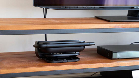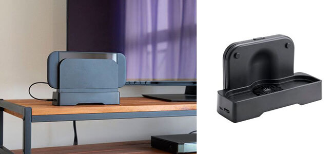 新製品は、本体底面に設置された送風ファンにより、ドック底面から風を送ることで熱を効率良く排出できるファン付のスタンド。テレビモード中の機器本体の発熱も抑えることができる。