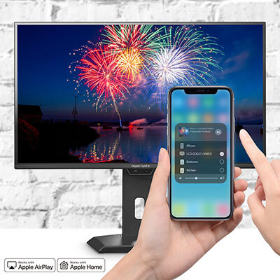 LCD-GDQ271JAWOSは、モニターにwebOS Hubを標準搭載している点が最大の特徴。Wi-Fiもしくは有線LANに接続するだけで、PC不要でNetflixやYouTube、Prime Video、Disney+、Hulu、TVer、U-NEXTなど、主要動画配信サービスが視聴できる。テレビを置きたくないミニマルな人にとっては、モニター単体でエンタメ視聴が完結するチューナーレスTVとして使える。同一ネットワークに接続することで、スマホやPCの画面をワイヤレスで共有することが可能。スマホでは、AirPlay2もしくはMiracastを使用して、スマホのコンテンツを表示できる。デバイスから画面をワイヤレス共有し、写真や動画など、日常の記録が大画面で楽しめる。