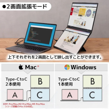 Mac/Windows両対応 上下2画面拡張ポータブルモニターは、PC作業の効率を高めたいビジネスパーソンから、外出先でのマルチモニター環境を必要とするクリエーター、学生まで幅広く活用できる。Type-Cケーブル1本でPCと接続が可能で、電源供給もPCから可能なため、外出先でも瞬時にマルチディスプレー環境を構築できる。