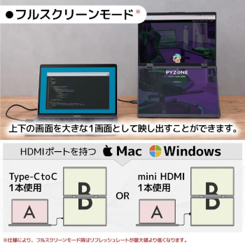 拡張モードでは、上下2枚を別々の画面として使用。フルスクリーンモードでは、2枚を一つの大画面として利用できる。目的に応じて表示方法を切り替えられ、動画編集、資料参照、コード確認など、ワークフローに合わせた理想的な表示環境を作れる。
