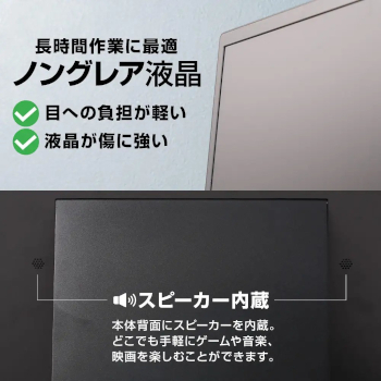 ノングレア液晶を採用し、長時間作業でも眼が疲れにくく上下画面の角度は無段階調整が可能。背面スタンドは引き出し式で自立できるため、机が狭い環境でも安定した作業スペースを確保できる。