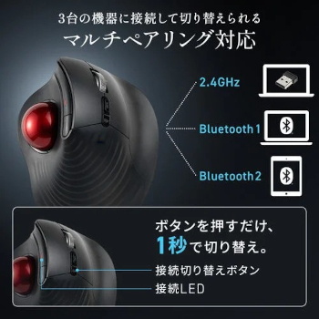 接続方式は、Bluetooth×2台、USBレシーバー(2.4GHz)×1台の計3台を登録でき、底面ボタンでワンタッチ切り替えが可能。職場PCや自宅PC、タブレット端末など、複数デバイスを1台のトラックボールでシームレスに操作できる。