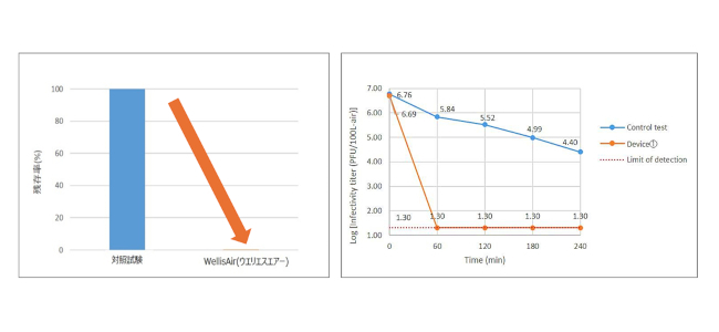 今回の試験結果から、「ウエリスエアー」には空間中のA型インフルエンザウイルス(H3N2)感染価を低減させる可能性があることが確認された。同社では、今後も実空間における効果検証を進めていく予定。