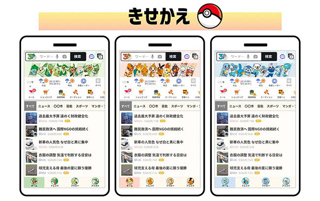 Yahoo! JAPANのアプリやスマホブラウザー版トップページ、検索結果ページでは、ポケモンデザインの特別テーマが設定できる。デザインは「くさ」「ほのお」「みず」をテーマにした3種類で、気分によって好きなタイプに変更できる。