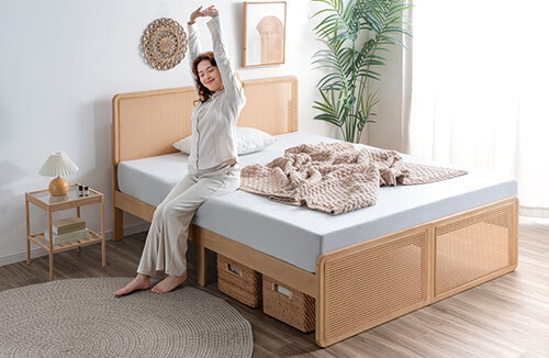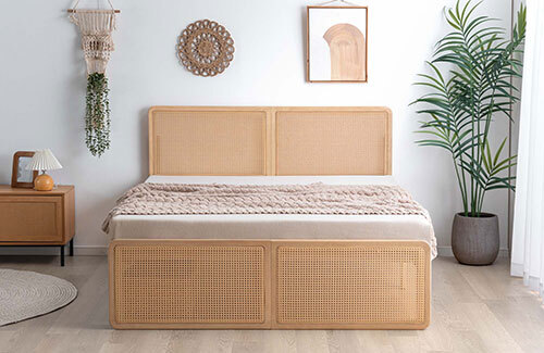 「ラタン調ベッド」は、ヘッドボードとフットボードにラタン調デザインを採用することで、ラタンならではの美しい編み目を贅沢に楽しめる。自然な風合いで部屋に馴染みつつ、編み目が作る立体感が寝室にほどよいアクセントを与えてくれる。
