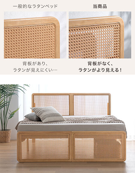 一般的にはラタン部分の後ろに背板があるため、編み目が見えにくいが、「ラタン調ベッド」では魅せ方にこだわって、ラタン部分の後ろに背板を設けるのではなく、ラタンの魅力である特徴的な編み目や透け感がより綺麗に見える仕様を採用している。
