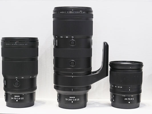 最新のレンズも出品されていた。代表例はニコンの「NIKKOR Z 70-200mm f/2.8 VR S II」だ。いわゆる広角から望遠までを3本のズームでカバーする代表的な「大三元レンズ」の一角。三脚座や保護カバーを外せば約998gと1kgを切る軽さが最大の特徴。画質を向上させると同時にレンズ構成を見直すことで実現。さらに全長も旧モデルより12mm短くなり、取り回しも楽になった。インターナルズーム機構の採用で、重心移動が極めて少なく、ジンバルを使った動画撮影にも威力を発揮する。また、三脚座はニコン初のアルカスイスタイプのクイックシューに対応。よりスピーディーに雲台への着脱ができるようになった。ただ税込みのニコンダイレクトショップ価格は44万3300円。購入するには、かなり勇気が必要だ。