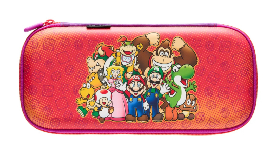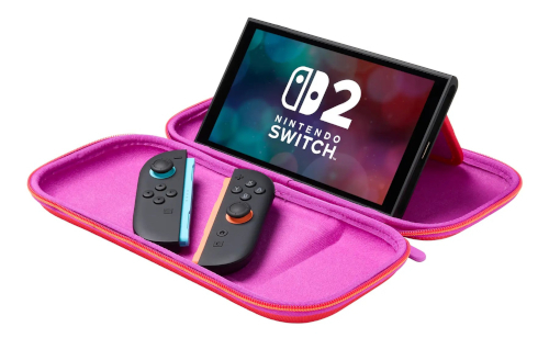「スリムケース for Nintendo Switch 2 - マリオ & フレンズ」は、ゲームカード10枚と本体を収納できるケース。ゲームカード用の起毛素材のポケットが本体に重なることで、画面のキズつきを防げる。本体を立てかければ、スタンドとしても使用できる。