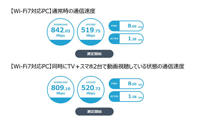 次にリビングのテレビでNetflixの4K動画、スマホ2台でYouTube動画を再生しながら、再度Wi-Fi 7対応PCの通信速度を測定してみた。結果は「下り809.10Mbps/上り520.72Mbps/PING 8.00ms/JITTER 1.58ms」。ほぼ数字が下がることなく、安定した通信を維持していることが分かる。