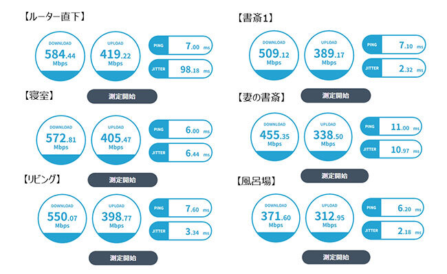 筆者宅では現在、Wi-Fi 7に対応する端末は1台(仕事用のPC)しかなく、全ての端末でパフォーマンスを完全に生かせるわけではない。したがって、各部屋でどのくらいの通信速度が出るのかの検証はWi-Fi 6対応のノートPCで行った。結果は以下の通りだ。
