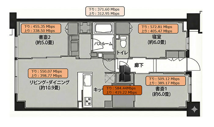 3LDK/1Gbps回線のマンションの各部屋における通信速度結果
