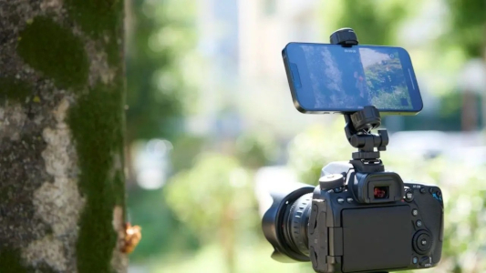 ホルダータイプのカメラ用マウントは、一眼レフのアクセサリーシューに装着が可能。スマホ縦横360度回転+前後180度可動で、好みのアングルを柔軟に設定できる。一眼レフで写真を撮りつつ、スマホで同時に動画撮影もできるため、Vlog撮影で特に活躍。コールドシューを二つ搭載しており、ライトやマイクの追加も可能だ。