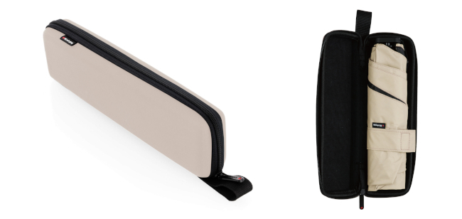 付属の「Knirps Dry Case」は、内側のマイクロファイバーが水分を吸収するため、バッグの中が濡れてしまうことはない(ただし防水仕様ではないので、水分を多く含んだ傘を収納すると、水分がドライケースから漏れる場合がある)。また、スリムなフラット形状を採用することによって、バッグなどのすき間にスッと収められる。