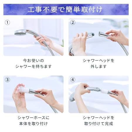 現在使用しているシャワーホースに取り付けるだけで使用可能で、取り付けにあたって工事や専門知識は必要ない。引っ越し時の取り外しも簡単なので、賃貸住宅でも導入しやすい。