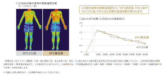 一方のマイクロバブルによる「美泡湯eco」は、さら湯よりも皮膚に熱が伝わりやすい。保湿効果のほか温熱、リラクゼーション効果などが得られる。