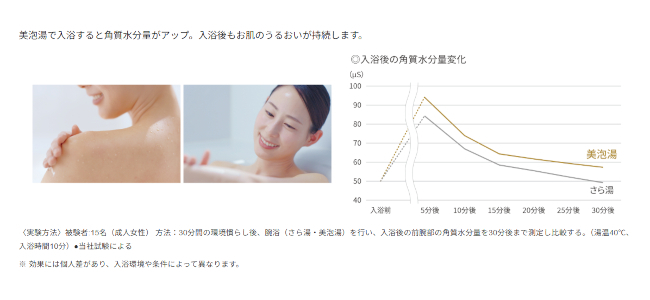 また、入浴後の角質の水分量はさら湯よりも高い。肌がしっとりして潤いが長続きする。