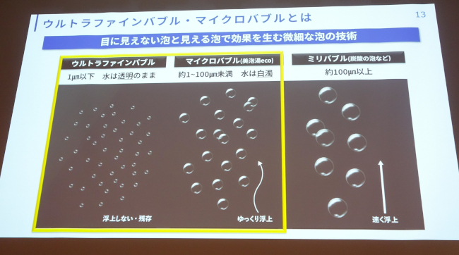 ウルトラファインバブルは直径1μm以下の目に見えないほど微細な泡で、水は透明だ。一方のマイクロバブルは直径約1~100μm未満の小さな泡で水は白濁になる。