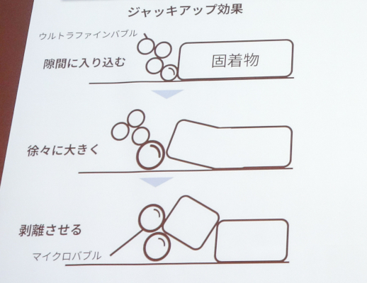 ウルトラファインバブルは、「ジャッキアップ効果」と呼ぶ仕組みでバスタブ内や壁、床のピンク汚れを落とす。微細な泡が固着物(汚れ)のすき間に入り、徐々に泡が大きくなることで固着物を剥離させるのだ。
