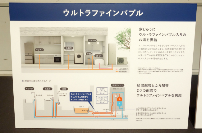 マイクロバブルはエコキュートの下部右側にある「美泡湯ユニット」で生成する。ただ、同ユニットから浴槽までの距離が長いため、泡による白濁状態を維持しにくいという課題があった。これを解決するために、浴槽の水を循環させる「美泡湯用ふろ接続アダプター」を新たに開発。浴槽を白濁状態のマイクロバブルで満たすことに成功した。