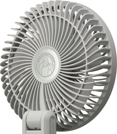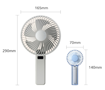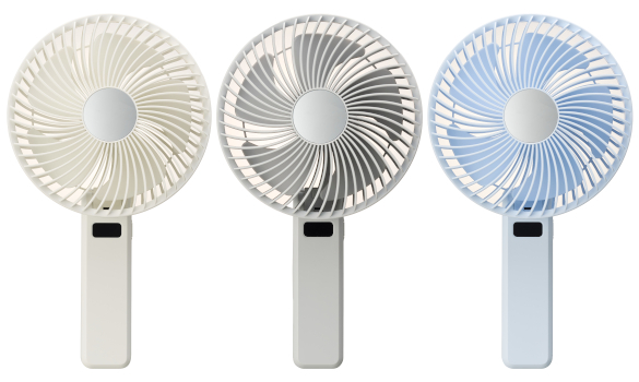 ファン部分の直径は約16.5cm、羽根の大きさは約13.5cmと、一般的なハンディファンと比較して大きく、ドウシシャが2025年に販売していた「二枚羽根大風量クリアハンディファン」のファン部分(直径約7cm)と比べると、約2.35倍に達する。