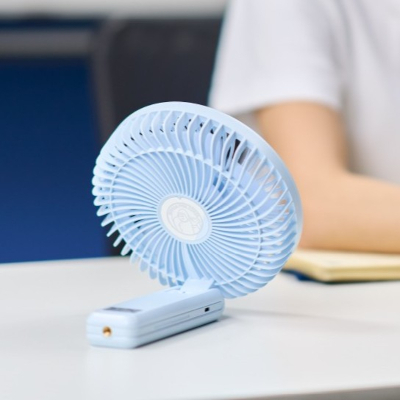 ハンディ部分を折りたためば、据え置き型のデスクファンとして使用できる。屋外・屋内問わず使える2WAYタイプで、デスクファンとして使用する場合は、ファン部分の角度調整にも対応する。また、グリップ部底面には4分の1インチネジ穴を搭載しているため、市販のカメラ用三脚やスタンドなどに取り付けられる。