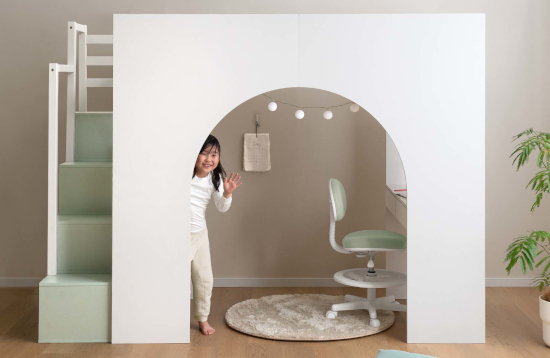 「HIDE-A ARCH」は、側面のアーチデザインからロフト下へと出入りが可能な設計で、その内部にはまるで秘密基地のような空間が広がる。入り口をくぐるたびに感じる高揚感と、自分だけの場所として過ごせる半個室の空間を通じて、遊び心と安心感を同時に提供する。独自のアーチフレームによって、自分だけの世界に没頭できる「特別な空間」を作り出し、眠る時だけでなく起きている時間も「自分だけの秘密基地」としてワクワク感を味わえる。