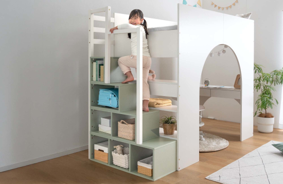 ベッドへの上り下りに使用する階段は、大きさの異なる7つのオープンラックとして活用できる。ランドセルや学校・習い事の道具、お気に入りの絵本などを、アイテムごとに分けて収納することが可能なので、子どもが自ら場所を決めて「片付ける」という自律心を育める。