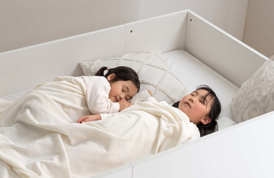 さらに、ベッドフレームのサイドとヘッド部分を通常よりも高めに設計することで、寝返りの多い子どもでも落下の心配がない。