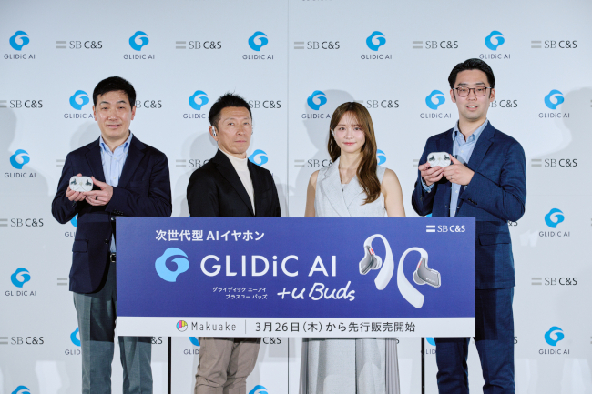 3月24日、SB C&SはGLIDiC AI+u Budsの発表会を開催した。会場には開発陣、マクアケ関係者、ゲストとしてタレントの森香澄さんが登壇。実演を交えながら製品の可能性を紹介した。