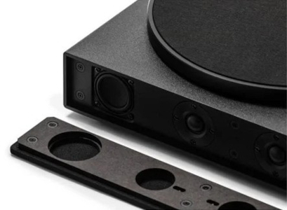 本体は異なる黒の素材を組み合わせた静かな存在感が特徴。音が止んだ後の余韻さえ引き立てる佇まいに仕上げている。低音2基、高音2基の4スピーカー構成を採用。木製キャビネットによる響きの良さも加わり、程よい低音の厚みと広がりのある音場を実現する。