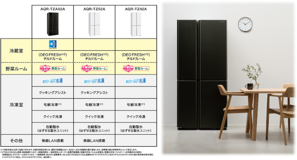 左右三つずつ計六つのボックスに分かれた冷凍室の容量は、500LクラスのTZA52AとTZ52Aが182L、420LのTZ42Aでも146Lと、前述のTXシリーズよりも大容量だ。冷凍室の機能では約-30℃の冷気で急速冷凍する「クイック冷凍」や、TXシリーズと同様に「おいシールド冷凍」と「旬鮮冷凍」も搭載。TZA52AとTZ52Aは、さらに前述の「クッキングアシスト」も搭載している。