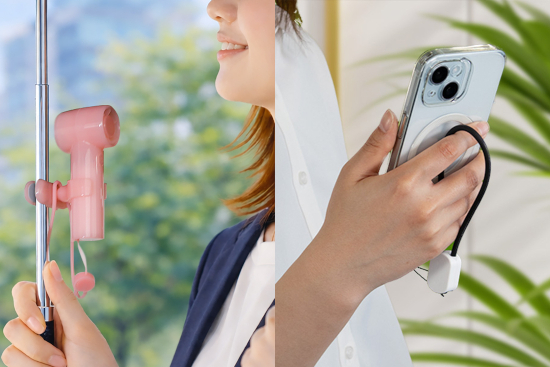 風量は弱・中・強の3段階で、最長約9時間のロング稼働も可能だ。日傘に取り付ければ、ハンズフリーでも使える。