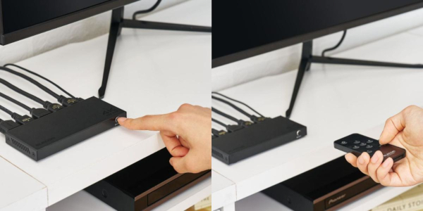 DH-SW4KB41BKは、1台のディスプレーで映画やゲーム、テレビ番組などを切り替えて楽しめるHDMI切替器。本体のボタン操作に加え、離れた場所から操作できるリモコンを付属し、再生機器の切り替えを簡単に行える。切替方式は、自動で入力を判別するオートモードと、意図しない切り替えを防ぐマニュアルモードの2種類を備える。