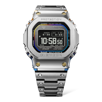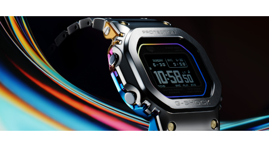 初代G-SHOCK「DW-5000C」のデザインを起点とし、グラデーションのレインボーIPを採用した金属製センターケースを採用。ベースとなる金色のIP加工を施した後、その上にレインボーのグラデーションIPを重ねる二段階工程により、奥行きのある輝きを実現した。ベゼルと金属製センターケースを上下から連結する独自構造は、ジェネレーティブデザインがもたらす複雑かつ立体的な構造に仕上げている。