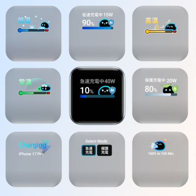 Anker独自のカスタムAIチップで、モデル名、出力ワット数、本体温度、充電の進行状況をリアルタイムで表示でき、しっかり充電が行われているかがすぐにわかる仕様だ。